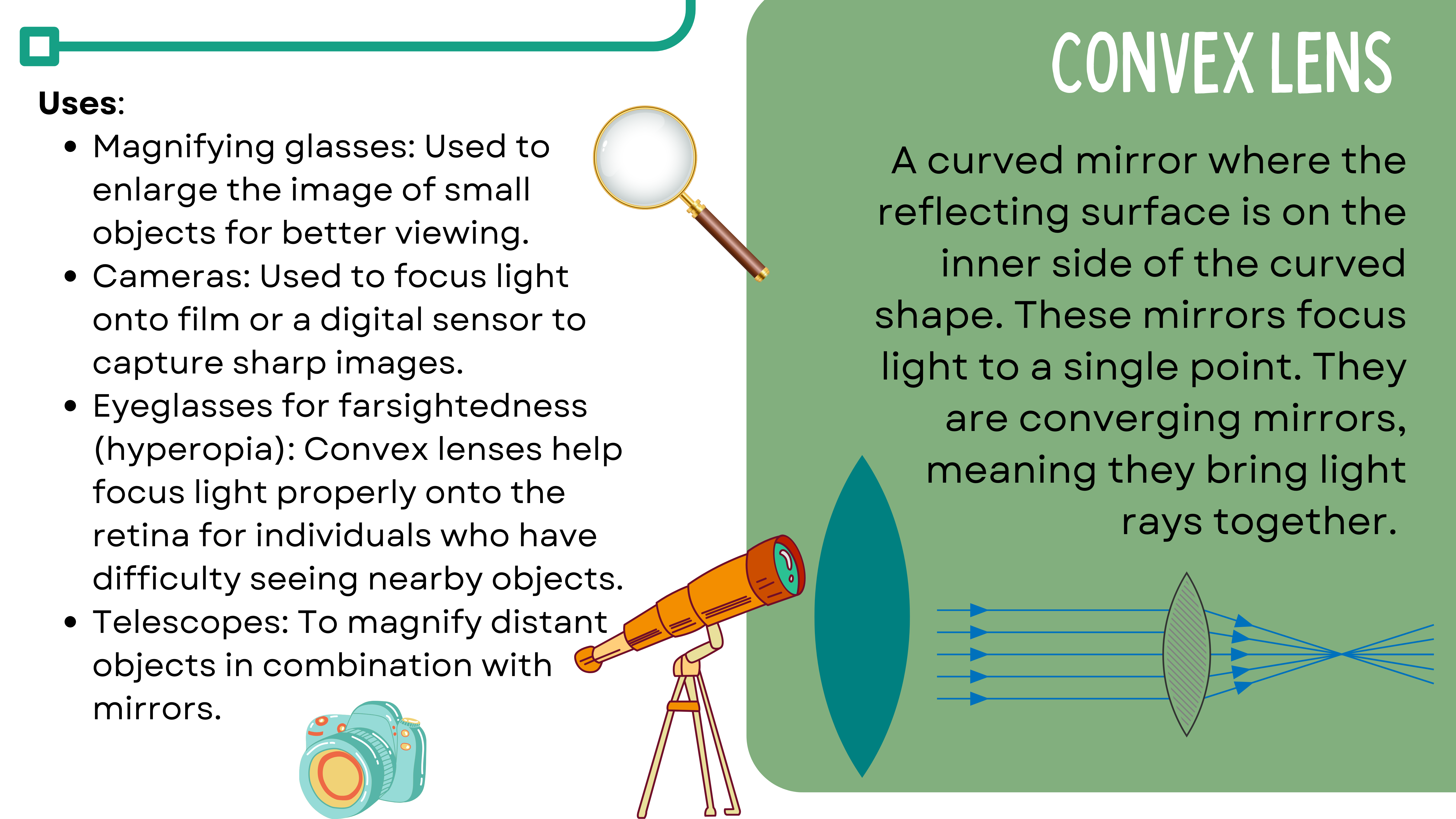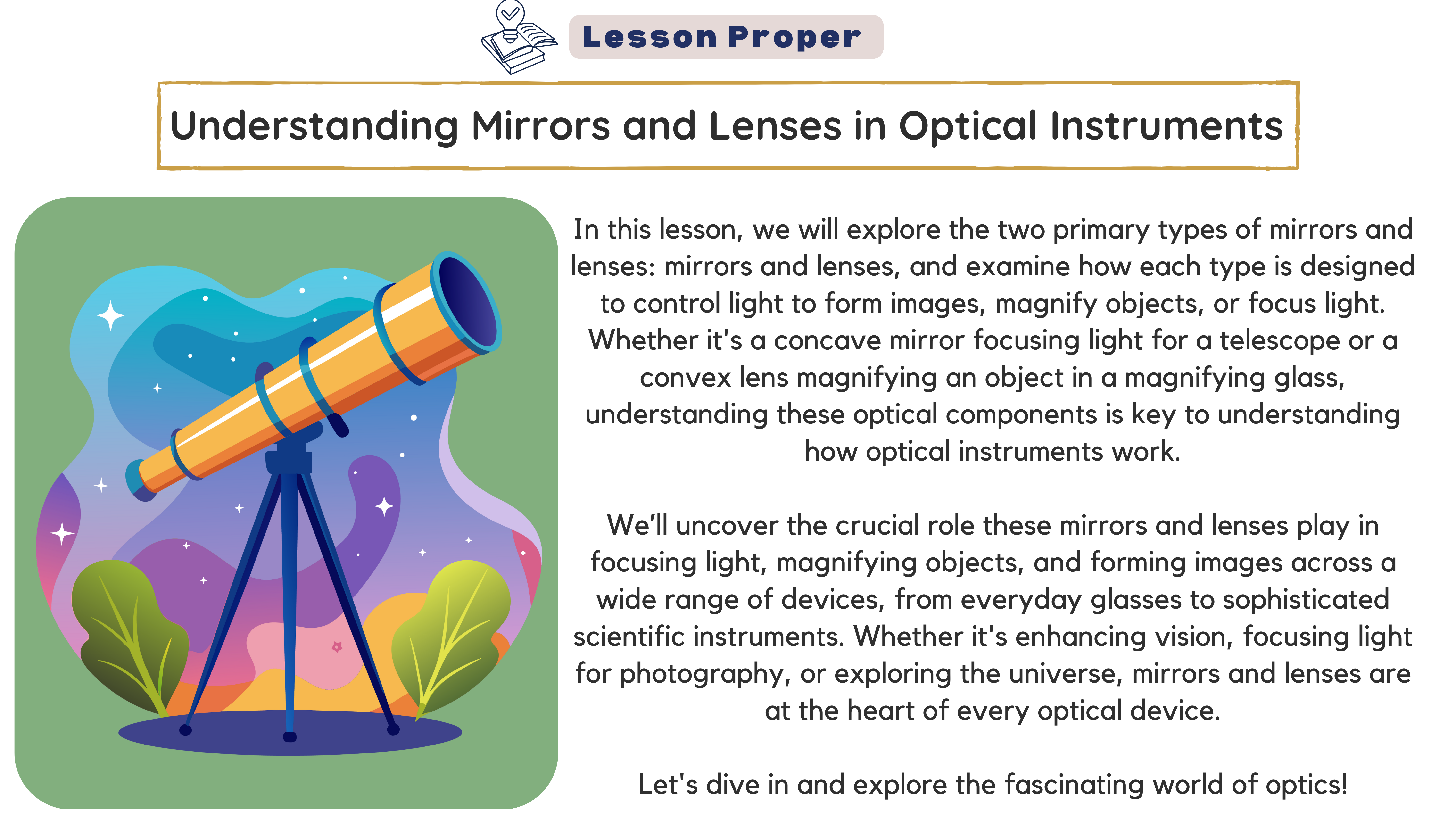 Learning Competency: Identify ways in which the properties of mirrors and lenses determine their use in optical instruments (e.g., cameras and binoculars). (S10FE-llj-54)